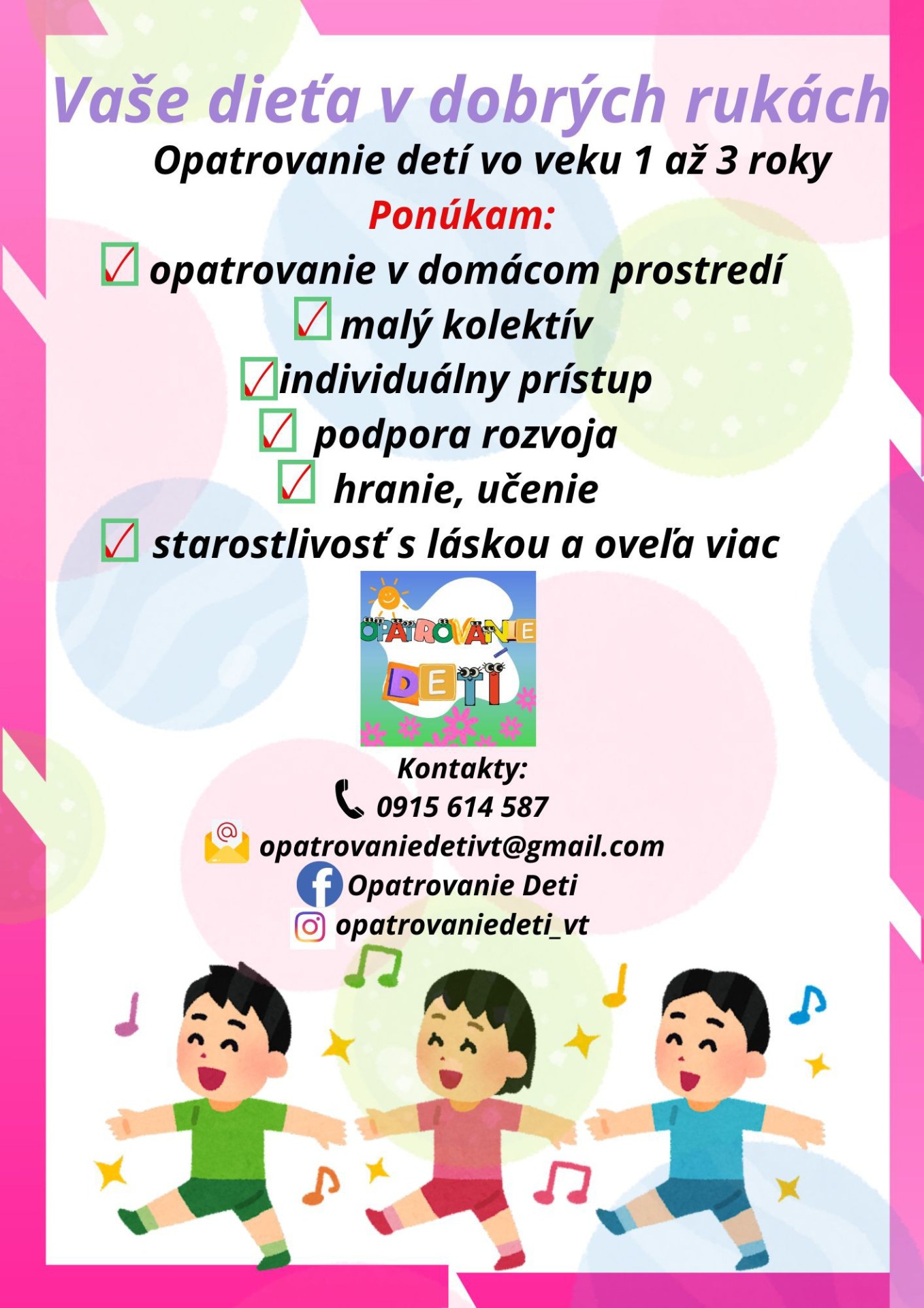 Poskytujem kvalitné opatrovanie detí v meste Vranov nad Topľou. Som zameraná na individuálny prístup ku každému dieťaťu, bezpečnosť a starostlivosť.